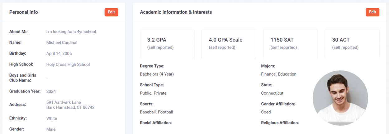 Review self-reported academics, interests and school preferences to find your ideal students